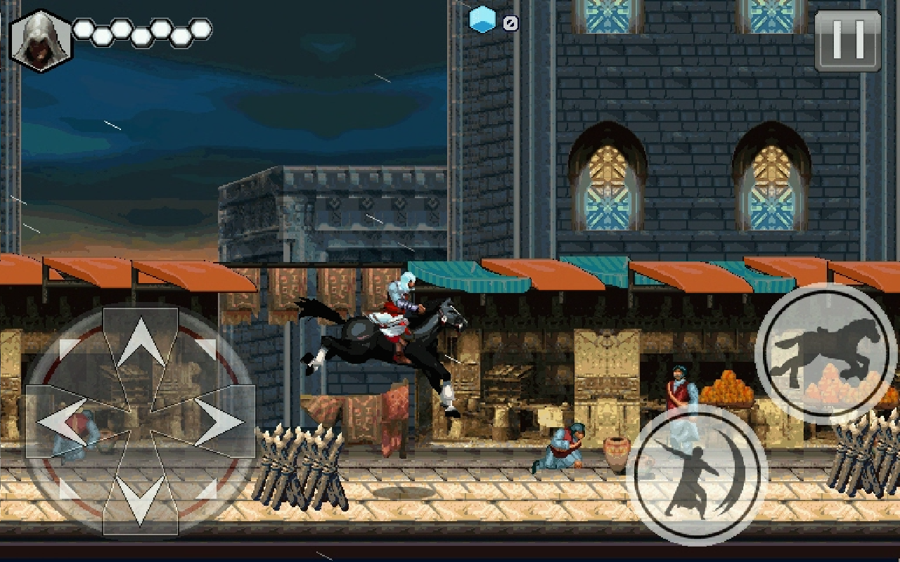 Mas a melhor parte é a variedade de movimentos que podemos realizar de forma simples com os controles da tela, como correr, abaixar, saltar em multiplas direções, atacar, trocar de arma (em algumas horas) cavalgar, voar, escalar, andar sobre e sob a corda, se balançar ... entre outras mobilidades e habilidades.
